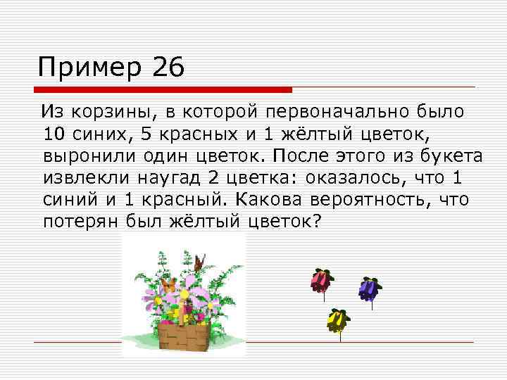 Пример 26 Из корзины, в которой первоначально было 10 синих, 5 красных и 1 жёлтый цветок, выронили один цветок. После этого из букета извлекли наугад 2 цветка: оказалось, что 1 синий и 1 красный. Какова вероятность, что потерян был жёлтый цветок?