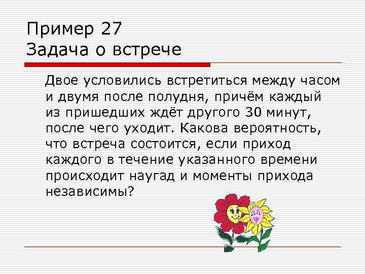 Пример 27 Задача о встрече Двое условились встретиться между часом и двумя после полудня, причём каждый из пришедших ждёт другого 30 минут, после чего уходит. Какова вероятность, что встреча состоится, если приход каждого в течение указанного времени происходит наугад и моменты прихода независимы?