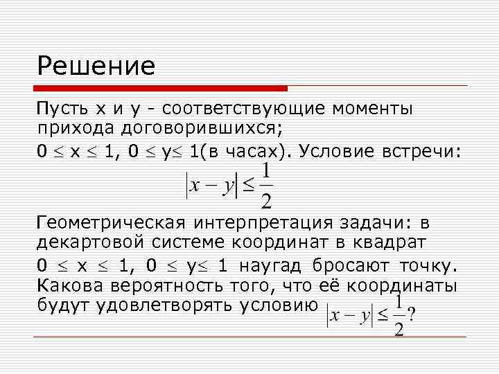 Решение Пусть x и y - соответствующие моменты прихода договорившихся; 0 x 1, 0 y 1(в часах). Условие встречи: Геометрическая интерпретация задачи: в декартовой системе координат в квадрат 0 x 1, 0 y 1 наугад бросают точку. Какова вероятность того, что её координаты будут удовлетворять условию