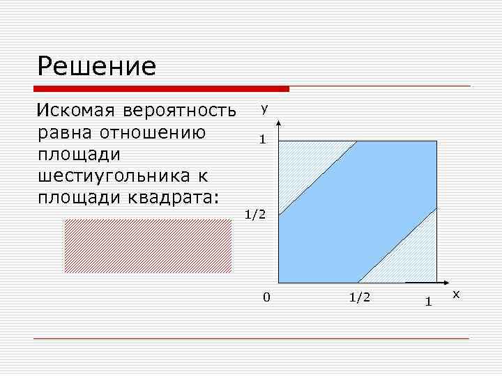 Решение Искомая вероятность равна отношению площади шестиугольника к площади квадрата: y 1 1/2 0 1/2 1 x