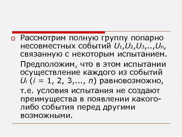 o Рассмотрим полную группу попарно несовместных событий U 1, U 2, U 3, . . , Un, связанную с некоторым испытанием. Предположим, что в этом испытании осуществление каждого из событий Ui (i = 1, 2, 3, . . . , n) равновозможно, т. е. условия испытания не создают преимущества в появлении какоголибо события перед другими возможными.