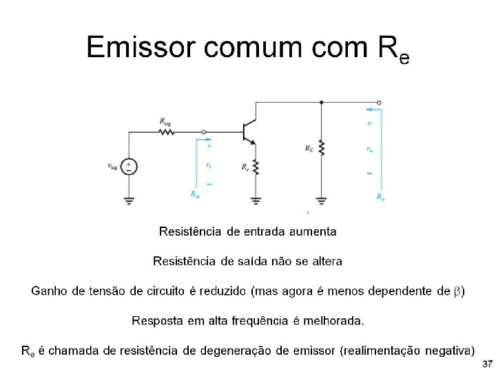 Coletor comum (seguidor de emissor) Ganho de tensão total (Gv) vi = vsig Rin /(Rin + Rsig) Rin = (b + 1)(re + RL) Av = RL/(re + RL) Ganho total menor que 1! Ganho próximo de 1 quando (b + 1)RL ~ Rsig 36
