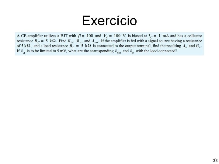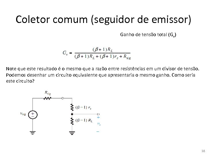 Coletor comum (seguidor de emissor) Ganho de tensão total (Gv) Note que este resultado é o mesmo que a razão entre resistências em um divisor de tensão. Podemos desenhar um circuito equivalente que apresentaria o mesmo ganho. Como seria este circuito? 37