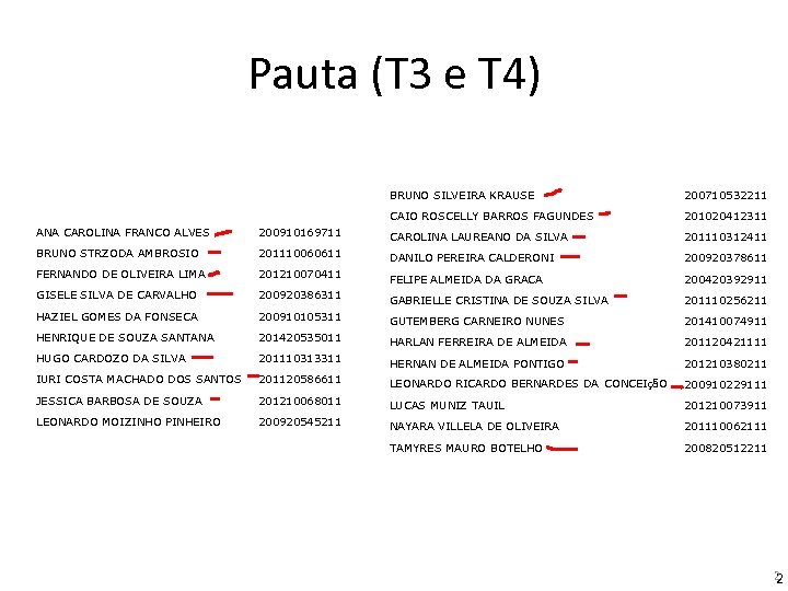 Pauta (T 3 e T 4) BRUNO SILVEIRA KRAUSE 200710532211 CAIO ROSCELLY BARROS FAGUNDES 201020412311 ANA CAROLINA FRANCO ALVES 200910169711 CAROLINA LAUREANO DA SILVA 201110312411 BRUNO STRZODA AMBROSIO 201110060611 DANILO PEREIRA CALDERONI 200920378611 FERNANDO DE OLIVEIRA LIMA 201210070411 FELIPE ALMEIDA DA GRACA 200420392911 GISELE SILVA DE CARVALHO 200920386311 GABRIELLE CRISTINA DE SOUZA SILVA 201110256211 HAZIEL GOMES DA FONSECA 200910105311 GUTEMBERG CARNEIRO NUNES 201410074911 HENRIQUE DE SOUZA SANTANA 201420535011 HARLAN FERREIRA DE ALMEIDA 201120421111 HUGO CARDOZO DA SILVA 201110313311 HERNAN DE ALMEIDA PONTIGO 201210380211 IURI COSTA MACHADO DOS SANTOS 201120586611 LEONARDO RICARDO BERNARDES DA CONCEIçãO 200910229111 JESSICA BARBOSA DE SOUZA 201210068011 LUCAS MUNIZ TAUIL 201210073911 LEONARDO MOIZINHO PINHEIRO 200920545211 NAYARA VILLELA DE OLIVEIRA 201110062111 TAMYRES MAURO BOTELHO 200820512211 2 2