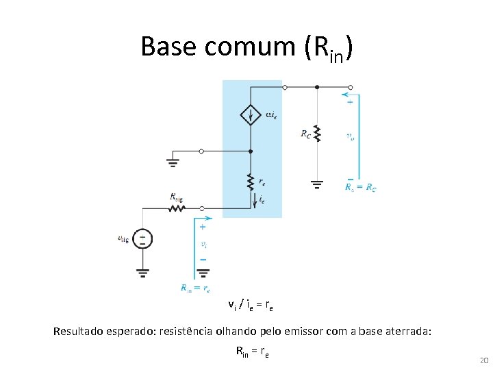 Base comum (Rin) vi / ie = re Resultado esperado: resistência olhando pelo emissor com a base aterrada: Rin = re 20