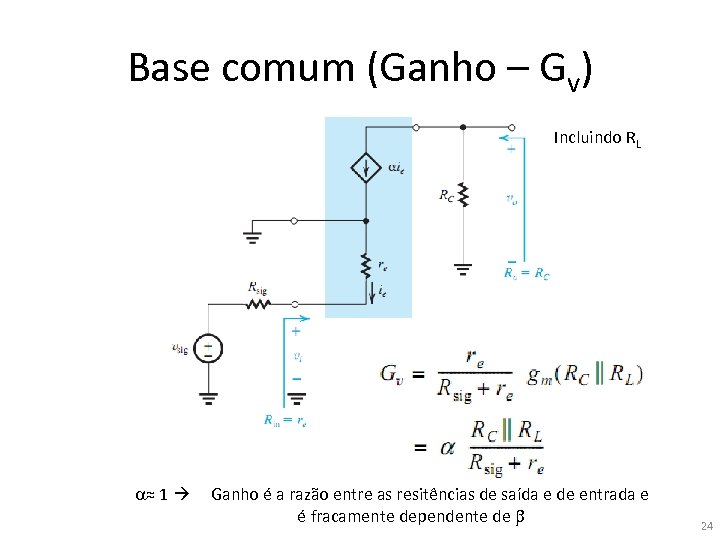 Base comum (Ganho – Gv) Incluindo RL a≈ 1 Ganho é a razão entre as resitências de saída e de entrada e é fracamente dependente de b 24