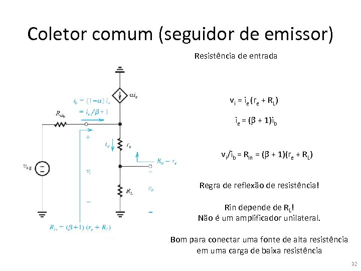 Coletor comum (seguidor de emissor) Resistência de entrada vi = ie (re + RL) ie = (b + 1)ib vi/ib = Rin = (b + 1)(re + RL) Regra de reflexão de resistência! Rin depende de RL! Não é um amplificador unilateral. Bom para conectar uma fonte de alta resistência em uma carga de baixa resistência 32