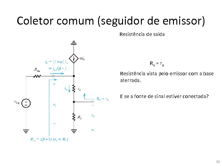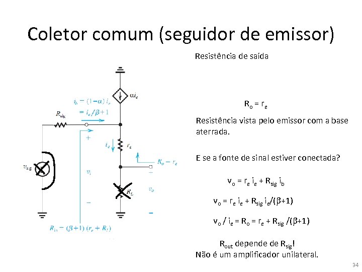 Coletor comum (seguidor de emissor) Resistência de saída Ro = re Resistência vista pelo emissor com a base aterrada. E se a fonte de sinal estiver conectada? 33
