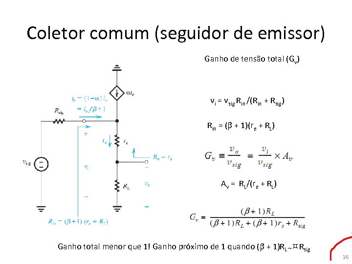 Coletor comum (seguidor de emissor) Ganho de tensão (Av) vi = ie (re + RL) vo = RL ie vo / vi = Av = RL/(re + RL) Fazendo RL Ganho de tensão de circuito aberto (Avo) vo / vi = 1 35