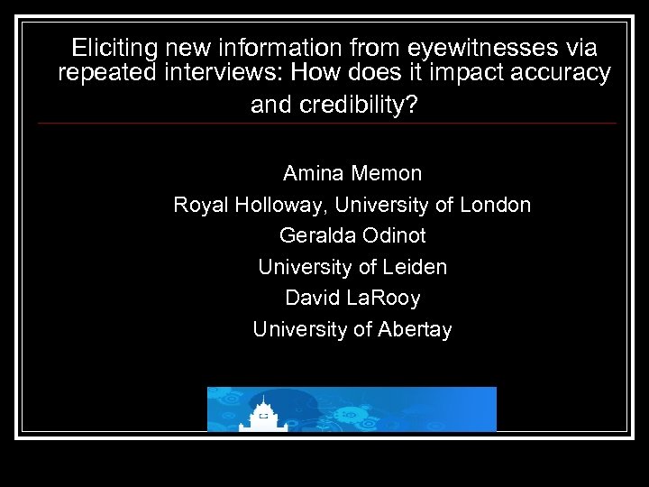 Eliciting new information from eyewitnesses via repeated interviews: How does it impact accuracy and credibility? Amina Memon Royal Holloway, University of London Geralda Odinot University of Leiden David La. Rooy University of Abertay