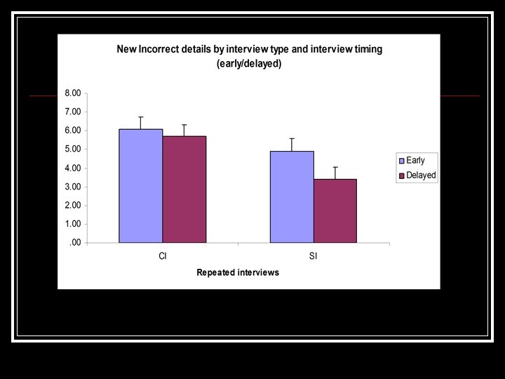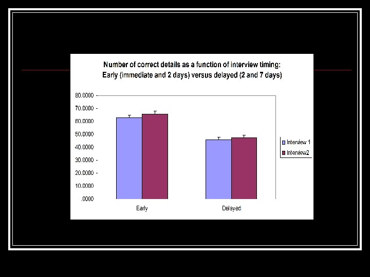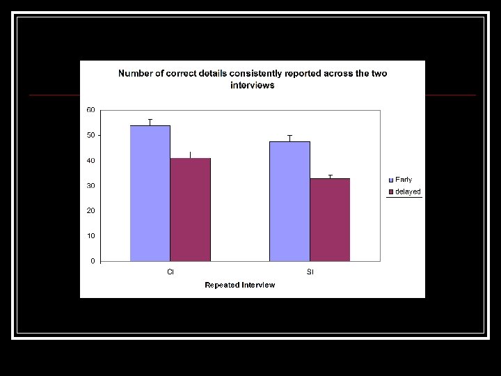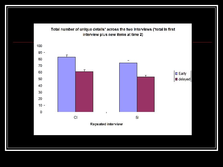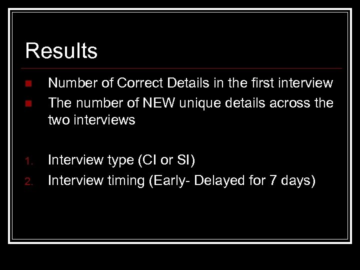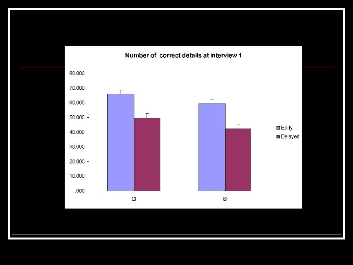 Results n n 1. 2. Number of Correct Details in the first interview The number of NEW unique details across the two interviews Interview type (CI or SI) Interview timing (Early- Delayed for 7 days)