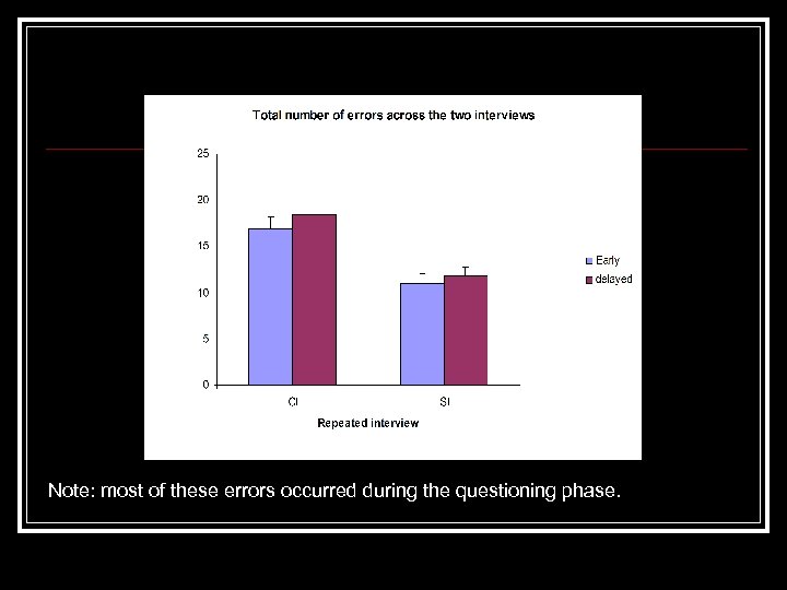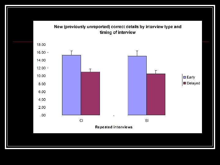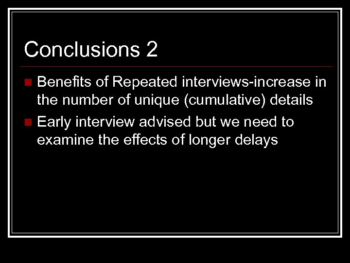 Conclusions 1 n n n Clear effects of early interview and repeated testing- gain in new correct details with small increase in errors CI advantage in correct details and consistent details- important for credibility CI small increase in reporting of erroneous detail- there were fewer errors in the free recall phase most arose in the questioning sequence.