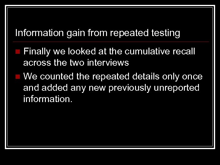 Information gain from repeated testing Finally we looked at the cumulative recall across the two interviews n We counted the repeated details only once and added any new previously unreported information. n