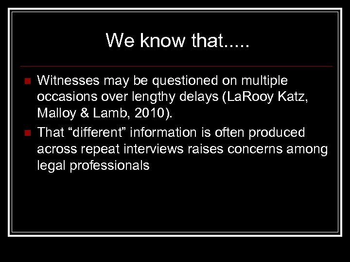 We know that. . . n n Witnesses may be questioned on multiple occasions over lengthy delays (La. Rooy Katz, Malloy & Lamb, 2010). That “different” information is often produced across repeat interviews raises concerns among legal professionals