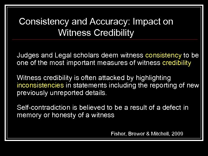 Consistency and Accuracy: Impact on Witness Credibility Judges and Legal scholars deem witness consistency to be one of the most important measures of witness credibility Witness credibility is often attacked by highlighting inconsistencies in statements including the reporting of new previously unreported details. Self-contradiction is believed to be a result of a defect in memory or honesty of a witness Fisher, Brewer & Mitchell, 2009