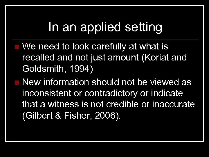 In an applied setting We need to look carefully at what is recalled and not just amount (Koriat and Goldsmith, 1994) n New information should not be viewed as inconsistent or contradictory or indicate that a witness is not credible or inaccurate (Gilbert & Fisher, 2006). n