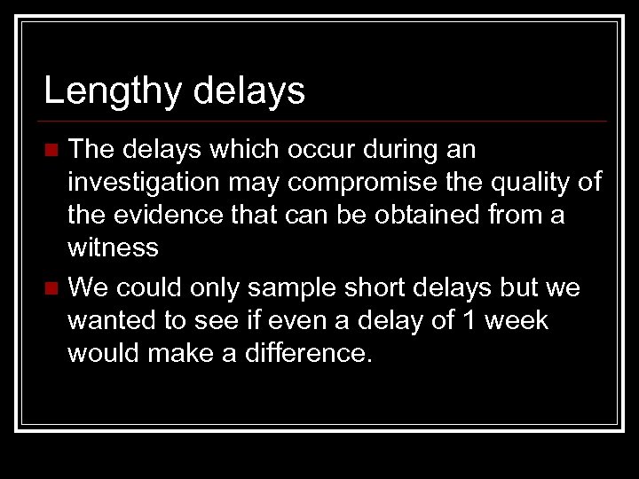 Lengthy delays The delays which occur during an investigation may compromise the quality of the evidence that can be obtained from a witness n We could only sample short delays but we wanted to see if even a delay of 1 week would make a difference. n