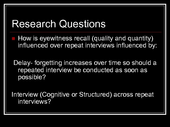 Research Questions n How is eyewitness recall (quality and quantity) influenced over repeat interviews influenced by: Delay- forgetting increases over time so should a repeated interview be conducted as soon as possible? Interview (Cognitive or Structured) across repeat interviews?