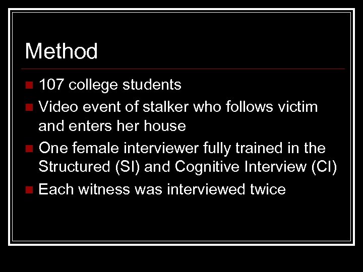 Method 107 college students n Video event of stalker who follows victim and enters her house n One female interviewer fully trained in the Structured (SI) and Cognitive Interview (CI) n Each witness was interviewed twice n