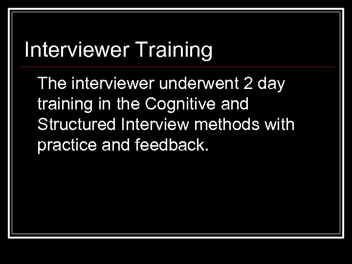 Interviewer Training The interviewer underwent 2 day training in the Cognitive and Structured Interview methods with practice and feedback.