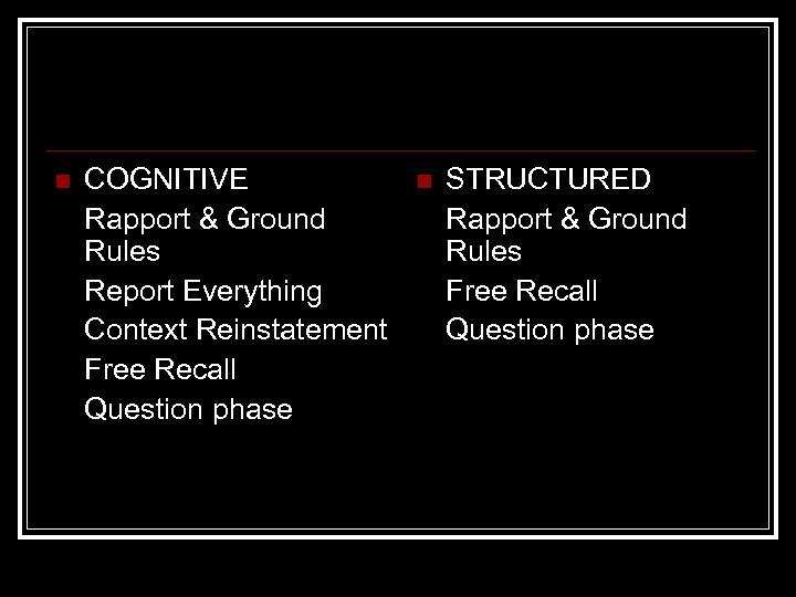 n COGNITIVE Rapport & Ground Rules Report Everything Context Reinstatement Free Recall Question phase n STRUCTURED Rapport & Ground Rules Free Recall Question phase