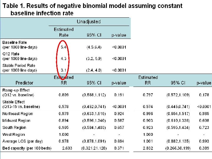 Table 2. Results of negative binomial model assuming constant baseline infection rate and adding compliance variables Main driver for pediatric CA-BSI reduction is Covariate Maintenance Bundle not insertion practices Unadjusted Relative Rate (RR) Adjusted Relative Rate (RR) Estimated RR 95% CI for RR Stable Effect vs. Q 12 0. 703 (0. 541, 0. 913) 0. 981 (0. 73, 1. 319) Northeast Region 0. 880 (0. 434, 1. 785) 0. 746 (0. 456, 1. 219) Midwest Region 0. 919 (0. 458, 1. 844) 0. 752 (0. 508, 1. 114) South Region 1. 184 (0. 575, 2. 438) 1. 015 (0. 629, 1. 638) West Region 1. 000 (1, 1) Bed capacity (per 100 beds) 6. 376 (0. 209, 194. 981) 8. 219 (0. 274, 246. 559) Average length of stay (per day) 1. 009 (0. 867, 1. 174) 1. 008 (0. 854, 1. 189) Insertion Compliance 0. 640 (0. 208, 1. 971) 0. 885 (0. 221, 3. 547) Maintenance Compliance 0. 382 (0. 188, 0. 774) 0. 409 (0. 197, 0. 851) NOTE: model is adjusted for stable vs. ramp-up effect, geographic region, bed capacity, and average length of stay.