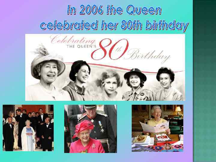 Elizabeth II's full name is Elizabeth Alexandra Mary. She was born on April 21, 1926. She never went to school and was taught by home tutors. In 1947 she married Prince Philip; he was created Duke of Edinburgh. A year later she gave birth to a son, Charles. In 1950 she gave a birth to a daughter, Anne. Elizabeth succeeded to the throne after the death of her father in February in 1952. Her second son, Andrew, was born in 1960 and the third, Edward, in 1964.