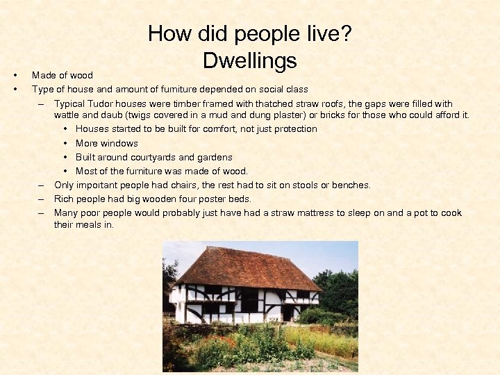 • • How did people live? Dwellings Made of wood Type of house and amount of furniture depended on social class – Typical Tudor houses were timber framed with thatched straw roofs, the gaps were filled with wattle and daub (twigs covered in a mud and dung plaster) or bricks for those who could afford it. • Houses started to be built for comfort, not just protection • More windows • Built around courtyards and gardens • Most of the furniture was made of wood. – Only important people had chairs, the rest had to sit on stools or benches. – Rich people had big wooden four poster beds. – Many poor people would probably just have had a straw mattress to sleep on and a pot to cook their meals in.