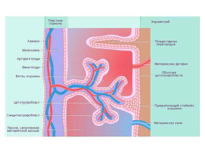 Полость хориона Сосуды хориона Желточный мешок Амнион Амниотическая ножка Цитотрофобласт Синцитиотрофобласт Лакуна, заполненная Соединительная ткань материнской кровью ворсины
