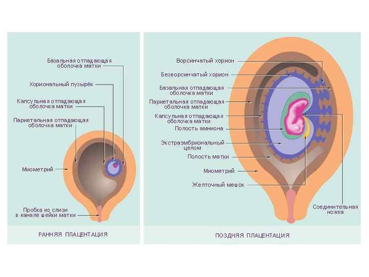 Амнион Зарод. стебелек Аллантоис Стенка матки Ворсины Экзоцелом хориона Хорион Плацента Ворсины хориона Плод Ворсины хориона Полость матки Полость Желт. мешок матки Пуповина Хорион Желт. мешок Хорион Пуповина Влагалище амнион