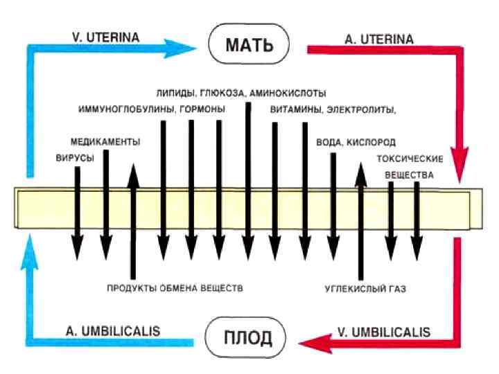 Гематоплацентарный барьер КРОВЬ ПЛОДА 1. ЭНДОТЕЛИЙ ГЕМОКАПИЛЛЯРОВ ПЛОДА (В ВОРСИНКАХ ХОРИОНА) 2. БАЗАЛЬНАЯ МЕМБРАНА КАПИЛЛЯРА 3. СТРОМА ВОРСИН 4. БАЗАЛЬНАЯ МЕМБРАНА ТРОФОБЛАСТИЧЕСКОГО ЭПИТЕЛИЯ 5. ЭПИТЕЛИЙ ВОРСИН - ЦИТОТРОФОБЛАСТ, СИМПЛАСТОТРОФОБЛАСТ ИЛИ ФИБРИНОИД ЛАНГХАНСА (МЕСТАМИ) КРОВЬ МАТЕРИ
