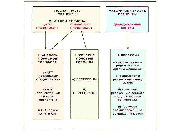 ПЛАЦЕНТА плодная часть материнская часть 3 6 5 3 1 2 3 6 4 1 - амниотическая оболочка 2 - хориальная пластинка 3 - ворсинки хориона 4 - септы (выросты decidua basalis) 5 - decidua basalis 6 - кровяные лакуны