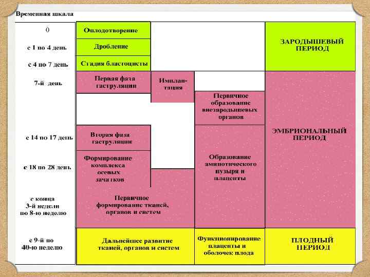 • Пренатальный период начинается с момента оплодотворения и образования зиготы и продолжается 280 дней. • Эмбриогенез подразделяется на: - начальный период (первая неделя) - эмбриональный период (со 2 -й по 9 нед. ) - плодный период (с 8 -9 нед. до рождения).