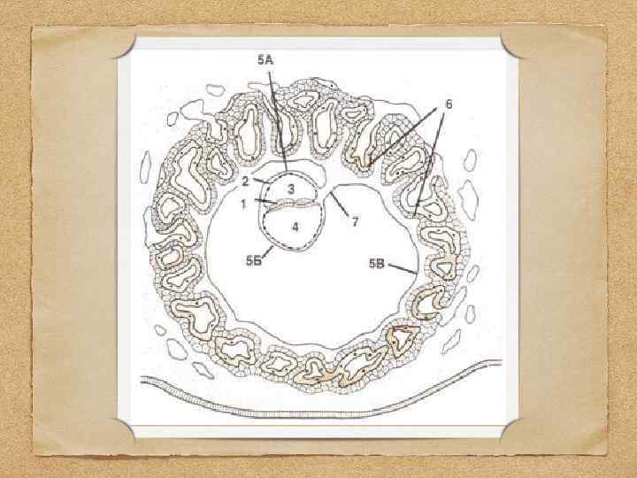 1 — зародышевый эпибласт. 2 — амниотическая эктодерма. 3 — амниотическая полость (между двумя предыдущими листками). 4 — желточный пузырек (образуется из гипобласта). Поверхности, обрастаемые внезародышевой мезодермой: 5 А — наружная поверхность амниотического пузырька; 5 Б — наружная поверхность желточного мешка; 5 В — внутренняя поверхность трофобласта. 6 — хорион: это трофобласт вместе с подросшей к нему мезодермой. 7 — амниотическая ножка: образуется из внезародышевой мезодермы и связывает зародыш с хорионом.