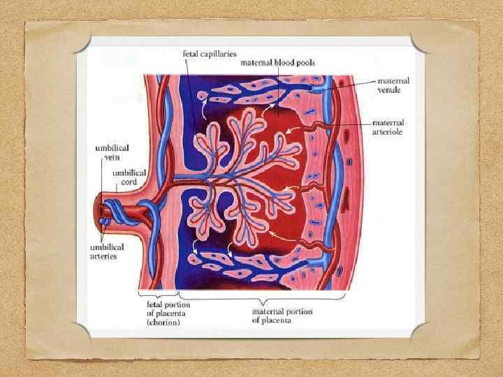 Обмен через плацентарный барьер Из материнской крови в кровь плода Из крови плода в материнскую (снабжение) кровь (выделение) • • • кислород питательные вещества (глюкоза, аминокислоты, свободные жирные кислоты, витамины) электролиты вода стероидные гормоны (кортизол, эстроген) антитела (Ig. G – обеспечивают пассивный иммунитет плода) белки плазмы крови (альбумин) некоторые белковые гормоны (тироксин, инсулин) эритроциты (очень мало) • • • углекислый газ метаболиты (мочевина, мочевая кислота, билирубин, креатин, креатинин) стероидные гормоны (хорионический гонадотропин, плацентарный прогестерон) вода эритроциты (очень мало)
