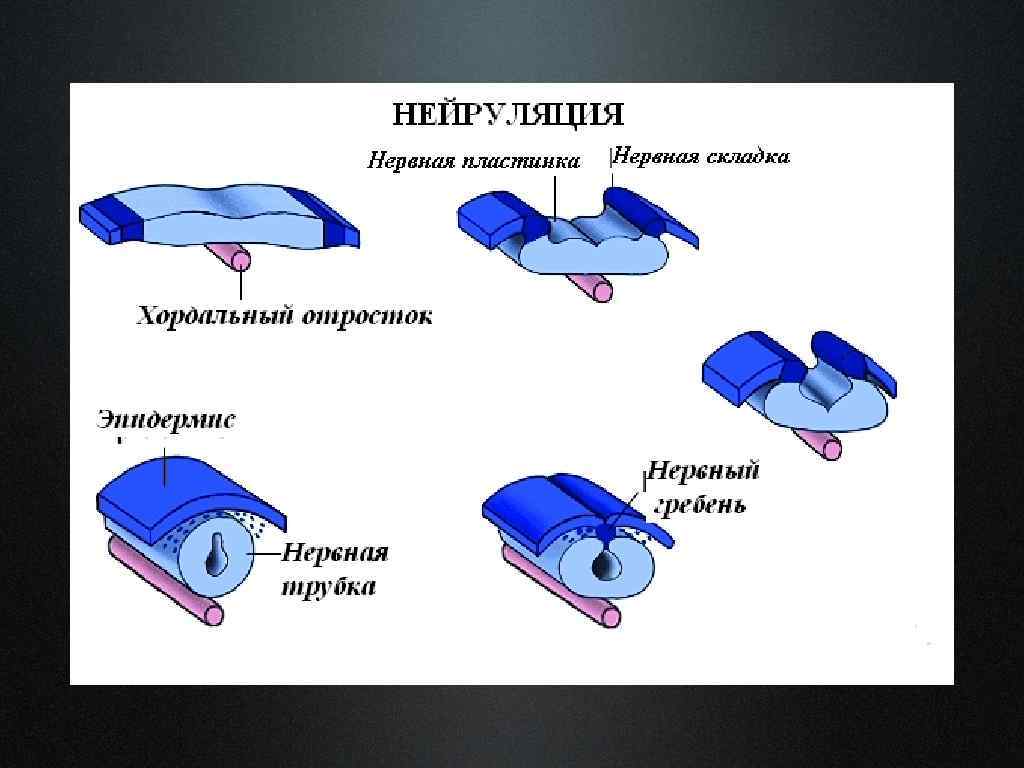 Процесс образования нервной трубки называется нейруляцией • Нервная трубка формируется из первичной эктодермы под влиянием сигнальных молекул, вырабатываемых клетками хорды, таким образом хорда является первичным индуктором нейроэктодермы. • В зоне образования нервной трубки в эктодерме вначале появляется утолщение – нервная пластинка. • В нервной пластинке образуется углубление – нервный желобок, а по краям желобка утолщения – нервные складки. • При смыкании нервных складок формируются нервная трубка и нервные валики (нервные гребни).