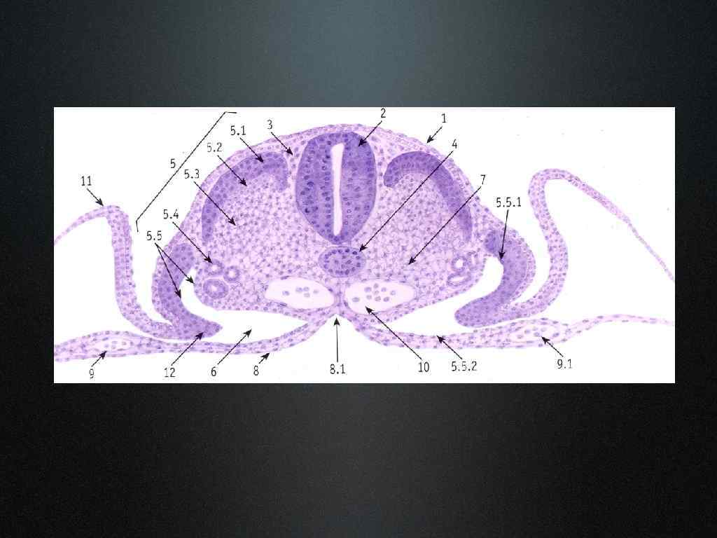 • I. Структуры зародыша Производные эктодермы: 1 — кожная эктодерма, 2 — нервная трубка. Производные мезодермы: 3 — хорда; составные части сомитов: 4 — дерматом, 5 — миотом, 6 — склеротом; 7 — нефрогонотом; 8 — висцеральный листок спланхнотома; 9 — париетальный листок спланхнотома; 10 — целомическая полость между этими листками; производные мезенхимы: 11 — парная аорта, 12 — клетки крови. Энтодерма: 13 — кишечная энтодерма (сворачивается в первичную кишку). • II. Внезародышевые образования Туловищные складки и желточный мешок: 14 — туловищные складки из четырех внезародышевых листков. Стенка желточного мешка: 15 — внезародышевая энтодерма; 16 — висцеральный листок внезародышевой мезодермы; 17 — кровеносные сосуды (с клетками крови) в стенке мешка. 18 — париетальный листок внезародышевой мезодермы; 19 — внезародышевая эктодерма; 20 — амниотическая складка.