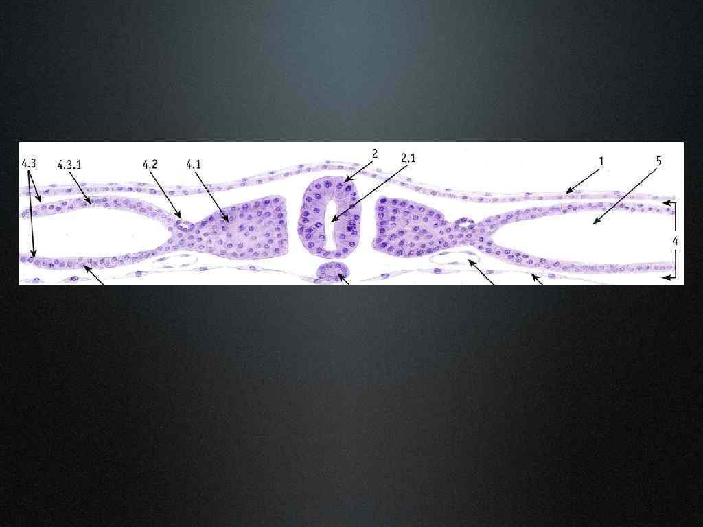 Зародыш курицы на стадии образования осевых зачатков органов. Окр. : гематоксилин На этой стадии развития зародыш имеет плоскую форму – он распластан на желтке (в препарате отсутствует). Тело зародыша ещё не отделено от внезародышевого материала и не имеет оформленной кишечной трубки. Под эпидермальной эктодермой (1) по средней линии тела располагается полая нервная трубка (2), под которой вплотную лежит хорда (3). По бокам от нервной трубки и хорды локализованы сомиты