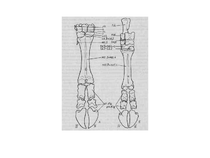 ПЕРЕДНЯЯ КОНЕЧНОСТЬ III. Manus III. autopodium • carpus radiale, intermedium, ulnare; +pisiforme centralia (1 -2) proximale (centrale), distale (mediale); carpalia distalia • metacarpus • phalanges digitorum ЗАДНЯЯ КОНЕЧНОСТЬ basipodium III. Pes tibiale, intermedium, fi bulare; centralia (1 -2) proximale (centrale), distale (mediale); tarsalia distalia • metatarsus metapodium praepollex, I – V, postminimus acropodium • tarsus praehallux, I – V, postminimus • phalanges digitorum