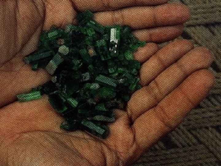 Zimbabwe Salisbury Sandawana Valley Deposits • S. G. =2. 755; R. I. E=1. 586, R. I. O=1. 593 • Mostly small stones (0. 5 carat or smaller), heavily flawed in larger sizes • Excellent colour • In schists invaded by pegmatites and quartz veins • Noted for inclusions of acicular tremolite, and for somewhat higher R. I. than Colombian and Brazilian emeralds.
