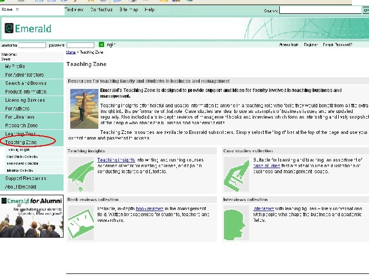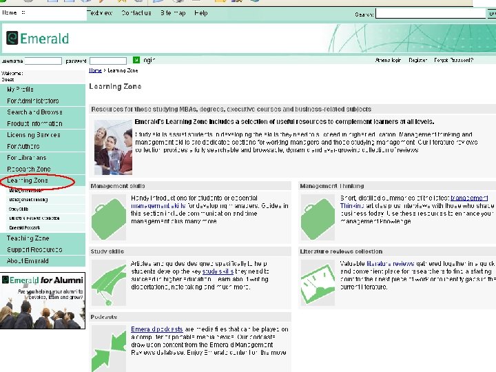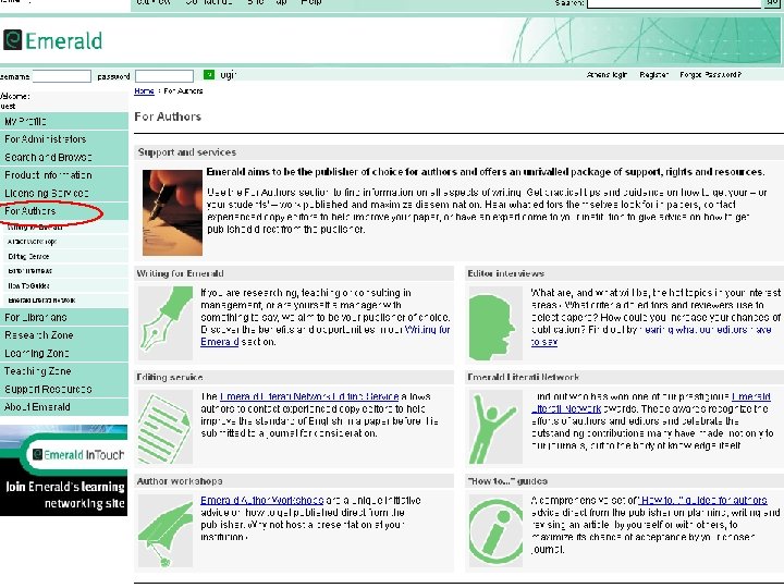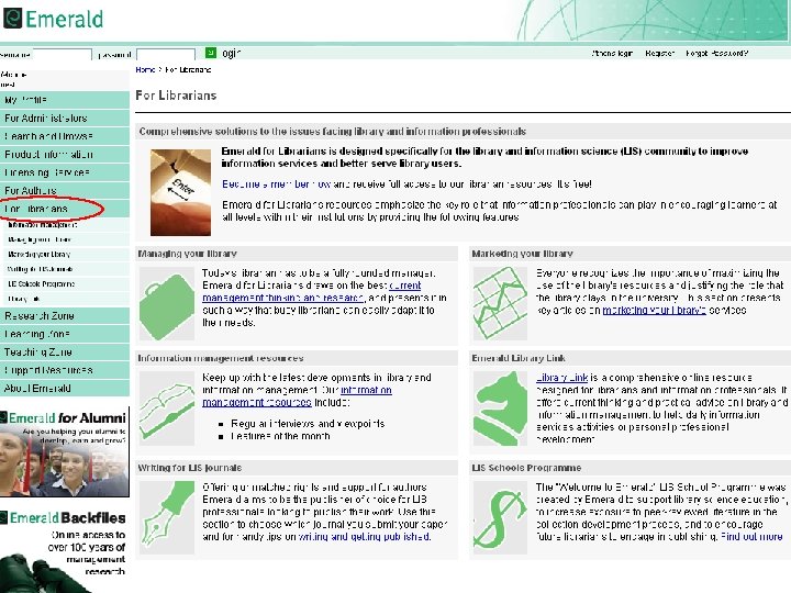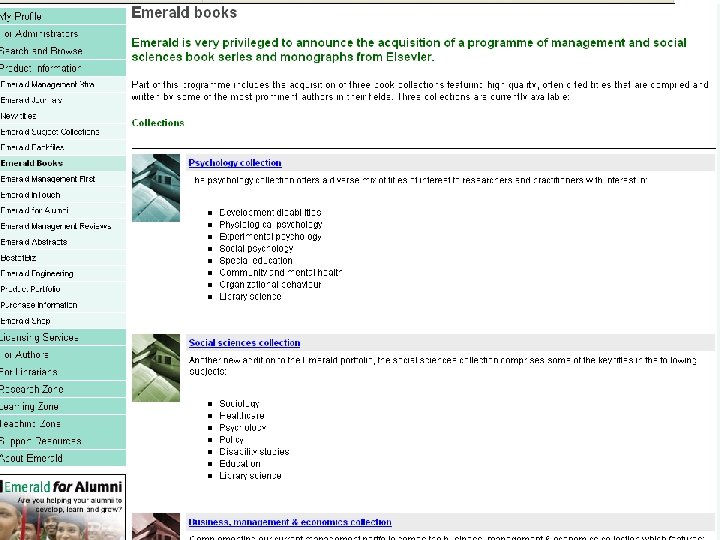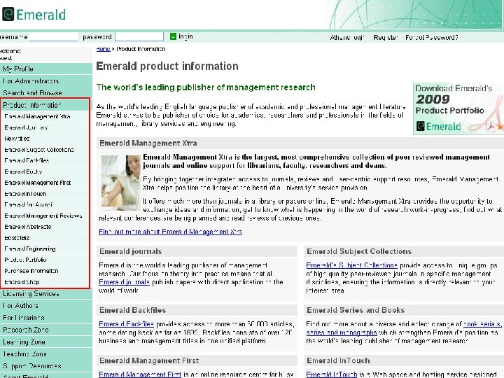Emerald Management Xtra • Собрания Emerald Management Xtra • Собрание конкретных исследований (более 1100 исследований) • Собрание обзоров литературных источников (свыше 700 обзоров) • Собрание интервью (более 500 интервью) • Обзоры книг (более 1500 обзоров) • База экспертных знаний по менеджменту (свыше 1000 статей) • Списки избранной литературы по менеджменту • Emerald для авторов • Emerald для исследователей • Emerald для студентов и преподавателей • Emerald для библиотекарей • Emerald для руководящего персонала и администраторов в системе образования • Emerald для руководителей и менеджеров предприятий • Отчеты о конференциях