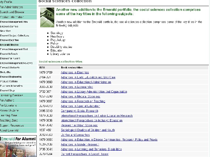 2009 Product Overview Business, Management & Economics Online Book Series Collection 62 Titles (6 titles added in 2009) Encompasses: Accounting, Economics, Enterprise, Health Care, HR, IB, LIS, Management Studies, Marketing, Org Studies, Strategy, Tourism Social Sciences Online Book Series Collection 38 Titles (3 titles added in 2009) Encompasses: Education; Politics and Policy; Sociology and Anthropology That’s 509 volumes & over 5000 chapters = 6% addition to the Emerald database