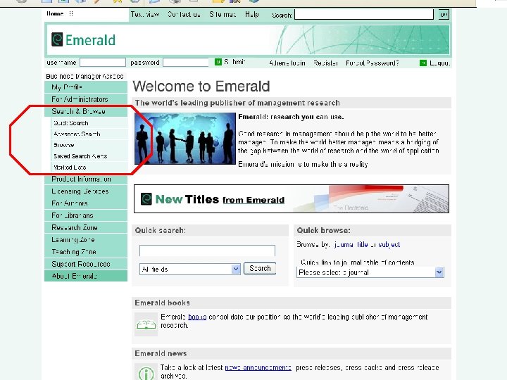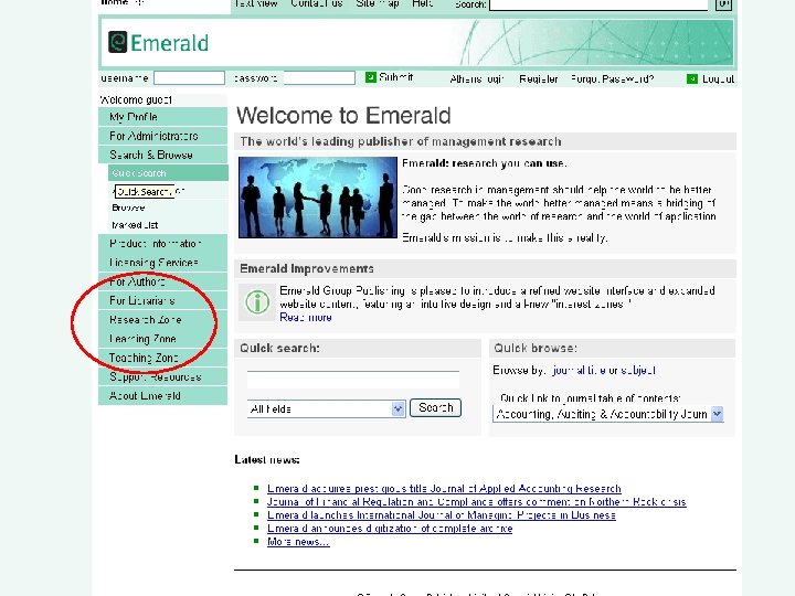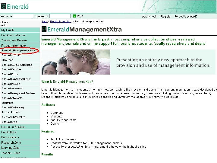Emerald Management Xtra • Собрания Emerald Management Xtra • Собрание конкретных исследований (более 1100 исследований) • Собрание обзоров литературных источников (свыше 700 обзоров) • Собрание интервью (более 500 интервью) • Обзоры книг (более 1500 обзоров) • База экспертных знаний по менеджменту (свыше 1000 статей) • Списки избранной литературы по менеджменту • Emerald для авторов • Emerald для исследователей • Emerald для студентов и преподавателей • Emerald для библиотекарей • Emerald для руководящего персонала и администраторов в системе образования • Emerald для руководителей и менеджеров предприятий • Отчеты о конференциях