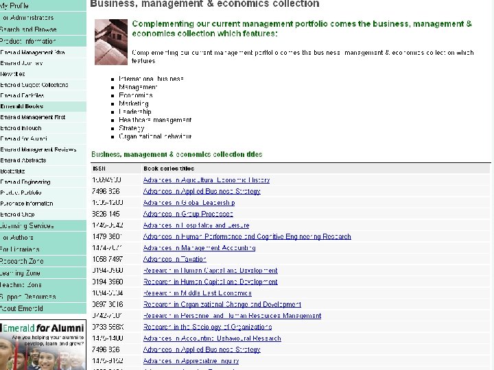 2009 Product Overview Business, Management & Economics Online Book Series Collection 62 Titles (6 titles added in 2009) Encompasses: Accounting, Economics, Enterprise, Health Care, HR, IB, LIS, Management Studies, Marketing, Org Studies, Strategy, Tourism Social Sciences Online Book Series Collection 38 Titles (3 titles added in 2009) Encompasses: Education; Politics and Policy; Sociology and Anthropology That’s 509 volumes & over 5000 chapters = 6% addition to the Emerald database