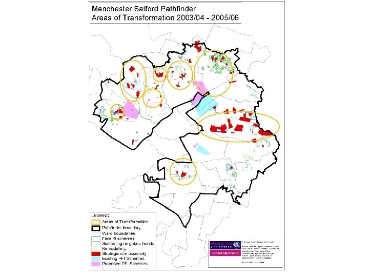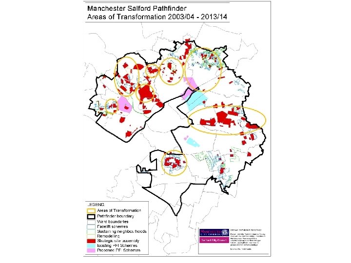 AREAS OF MAJOR INVESTMENT (TRANSFORMATION) CHARACTERISTICS England Manchester Salford Areas of Transformation £ 178, 558 £ 111, 228 £ 110, 253 £ 50, 698 3. 2% 7. 5% 6. 1% 12. 5% Proportion of LA properties classed as “Low Demand”* (2004) - 25. 8% - 66. 6% Worklessness Rate (2004) - 26. 0% 20. 3% 37. 3% 53. 4% 39. 5% 38. 3% 31. 6% No. burglaries per 1, 000 households (2004) 16 40 35 27 No. incidences of vehicle crime per 1, 000 households (2004) 35 73 53 78 Average House Prices(2004) Void Rate (2005) Proportion of pupils achieving 5+ GCSEs at Grade C or above (2004) * Data available for Manchester only
