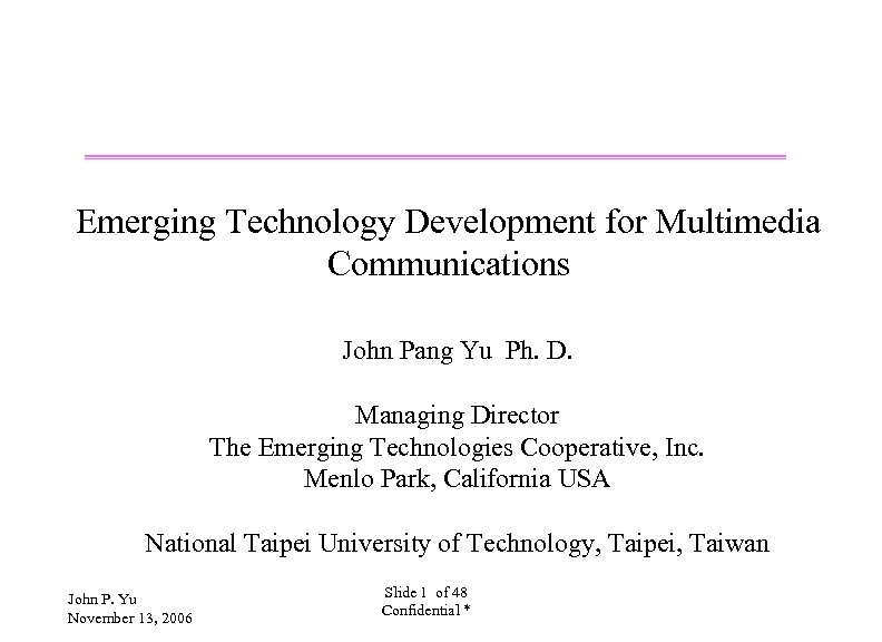 Emerging Technology Development for Multimedia Communications John Pang Yu Ph. D. Managing Director The Emerging Technologies Cooperative, Inc. Menlo Park, California USA National Taipei University of Technology, Taipei, Taiwan John P. Yu November 13, 2006 Slide 1 of 48 Confidential *