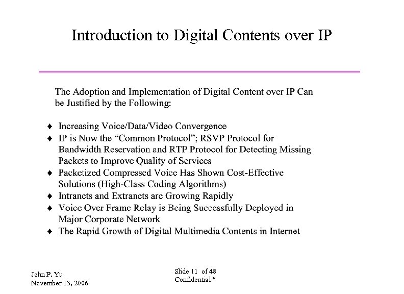 Introduction to Digital Contents over IP John P. Yu November 13, 2006 Slide 11 of 48 Confidential *