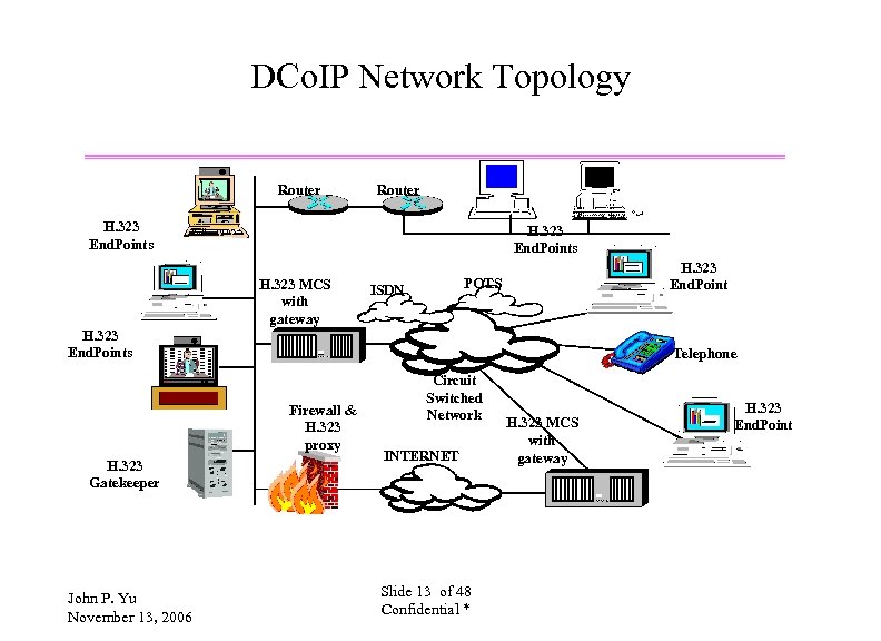 DCo. IP Network Topology Router H. 323 End. Points H. 323 MCS with gateway H. 323 End. Point POTS ISDN H. 323 End. Points Telephone Firewall & H. 323 proxy H. 323 Gatekeeper John P. Yu November 13, 2006 Circuit Switched Network INTERNET Slide 13 of 48 Confidential * H. 323 MCS with gateway H. 323 End. Point