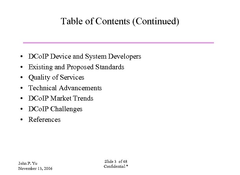 Table of Contents (Continued) • • DCo. IP Device and System Developers Existing and Proposed Standards Quality of Services Technical Advancements DCo. IP Market Trends DCo. IP Challenges References John P. Yu November 13, 2006 Slide 3 of 48 Confidential *