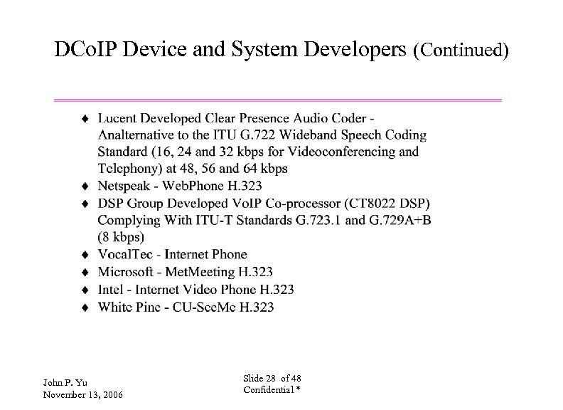DCo. IP Device and System Developers (Continued) John P. Yu November 13, 2006 Slide 28 of 48 Confidential *